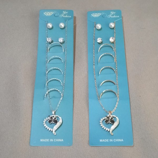 طقم فاخر يجمع بين الأناقة والكلاسيكية، يضم سلس على شكل قلب مزين بفراشة سوداء، مع خمسة خواتم متناسقة، وزوج أقراط كريستالي وزوج آخر لؤلؤي لإطلالة متجددة كل يوم.