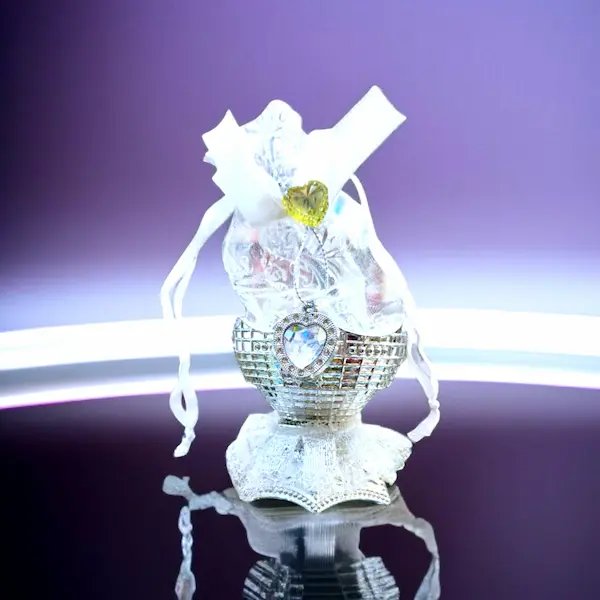 سلة توزيعات أنيقة مزينة بقاعدة شبك وربطة، تحتوي على كيس أورجانزا شفاف بداخله قلادة قلب فضي مرصع بالكريستال مع قلب أصفر صغير، موضوعة داخل وعاء زجاجي مزخرف بالدانتيل الأبيض، لتكون خيارًا مثاليًا للهدايا أو التوزيعات.