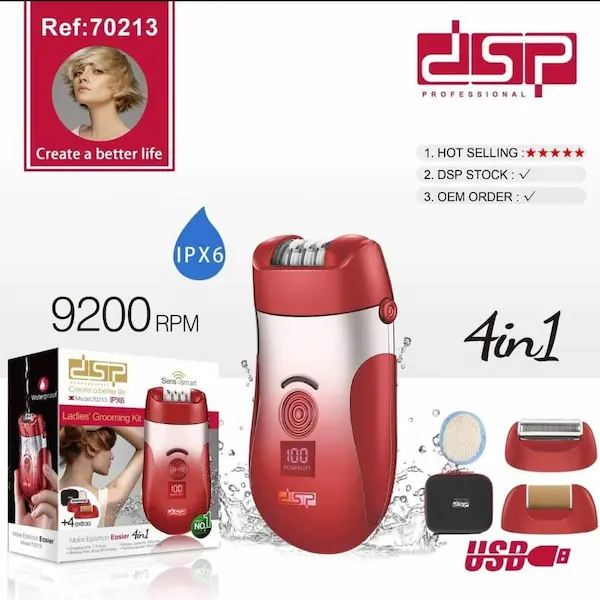 جهاز DSP 4 في 1 متعدد الوظائف للنساء، يمنحك بشرة ناعمة وخالية من الشعر غير المرغوب، مع نتائج تدوم حتى 4 أسابيع. مقاوم للماء ومناسب للاستخدام الجاف أو الرطب، ويأتي مع 4 رؤوس قابلة للتبديل لتلبية جميع احتياجاتك الجمالية.