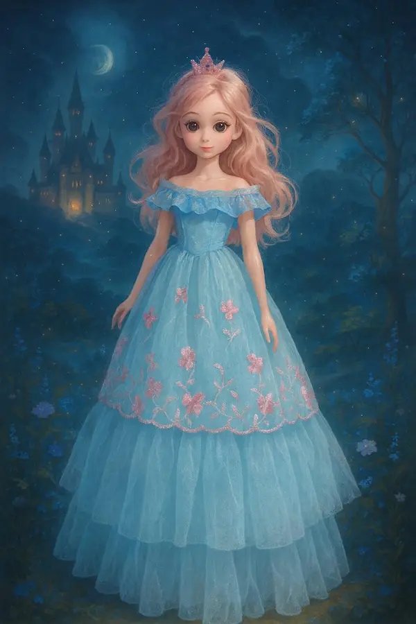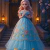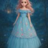 عروسة أميرة أنيقة بتصميم مستوحى من عالم الأميرات، ترتدي فستان سماوي فاخر مطرز بالورود الوردية وطبقات تول واسعة تضيف لمسة من الفخامة والجمال.