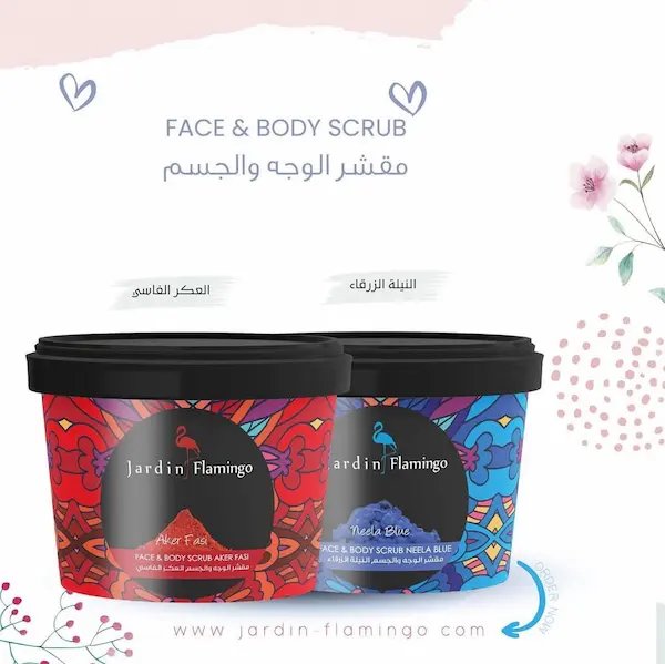 مقشر فاخر للوجه والجسم من جاردان فلامنجو، متوفر بنوعين: النيلة الزرقاء والعكر الفاسي. يزيل خلايا الجلد الميتة ويترك بشرتك ناعمة، مشرقة ومرطبة.