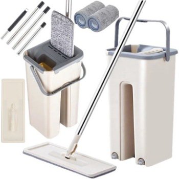 ممسحة مبتكرة بنظام غسيل وتجفيف ذاتي بدون لمس اليدين، مزودة بدلو مزدوج ورأس دوار 360° لتنظيف فعال وسهل لجميع أنواع الأرضيات.