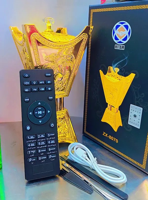المبخرة الذكية الذهبية تجمع بين الأناقة والتقنيات الحديثة، حيث تمنحك تجربة تبخير عطرية مميزة مع مكتبة روحانية كاملة تشمل القرآن الكريم، الأحاديث، والرقية الشرعية، بالإضافة إلى تصميم فاخر يزين منزلك بأجواء أنيقة ومريحة.