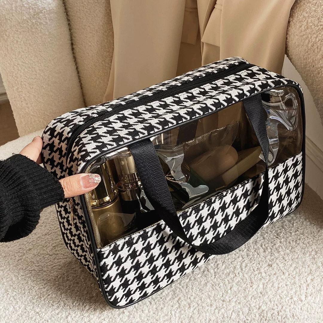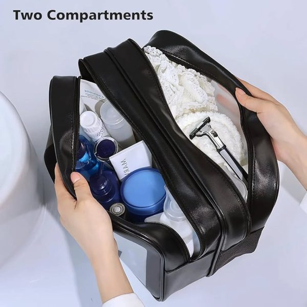 شنطة مكياج عملية وشفافة بتصميم عصري، مصنوعة من جلد البولي يوريثين المقاوم للماء، مثالية لتنظيم مستحضرات التجميل والإكسسوارات أثناء السفر أو الاستخدام اليومي.