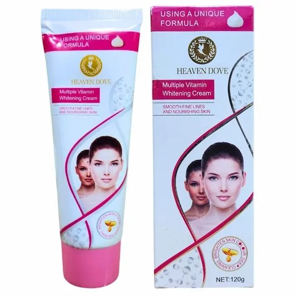 كريم HEAVEN DOVE بتركيبة متعددة الفيتامينات يعمل على تفتيح لون البشرة، تنعيم الخطوط الدقيقة، وتنظيف البشرة بعمق، ليمنحك بشرة مشرقة، ناعمة وصحية.