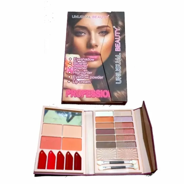 لوحة مكياج شاملة من UNUSUAL BEAUTY تحتوي على ظلال عيون، أحمر شفاه، أحمر خدود، هايلايتر، وفرش للتطبيق، مثالي للإطلالات اليومية والمناسبات.