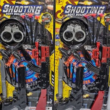يحتوي على مسدس بطلقت لينة آمنة مع إكسسوارات متنوعة تشمل النبلة، القيود (الكلبشات)، الخنجر البلاستيكي، القنابل، والصحن، مما يمنح الطفل تجربة لعب واقعية وآمنة في نفس الوقت.