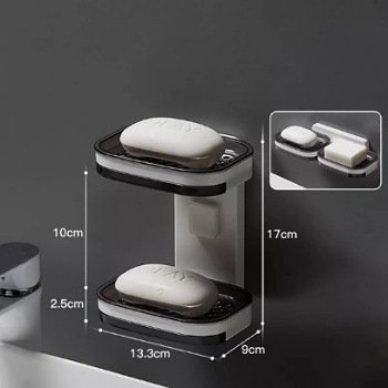 حامل صابون بلاستيكي بتصميم مزدوج أنيق، مقاوم للماء وسهل التثبيت بدون حفر، يحافظ على نظافة وجفاف الصابون بفضل ثقوب التصريف الذكية.