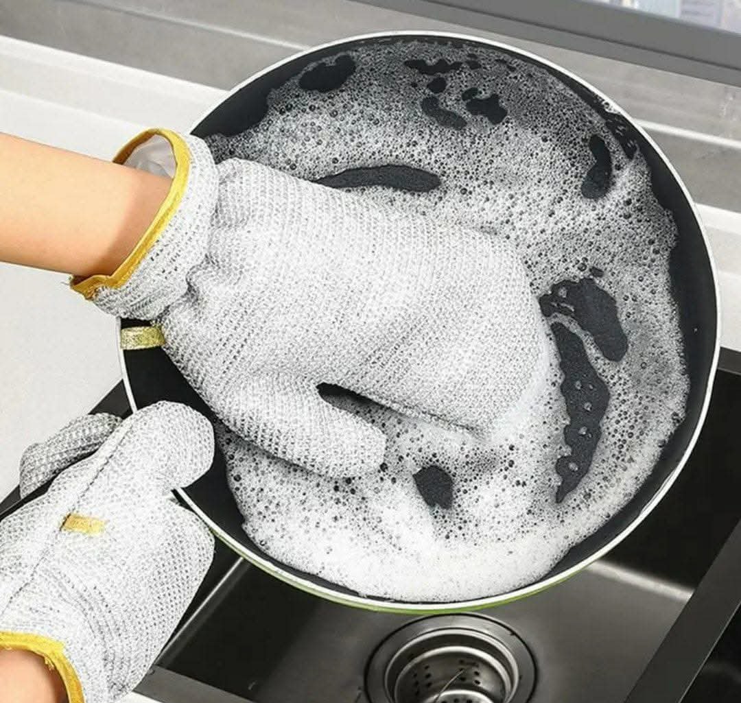 زوج قفاز تنظيف سلكي قوي ومتين مصنوع من الفولاذ المقاوم للصدأ، مثالي لإزالة الدهون والبقع العنيدة من الأواني والمقالي بسهولة وأمان.